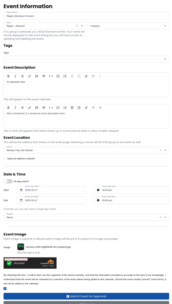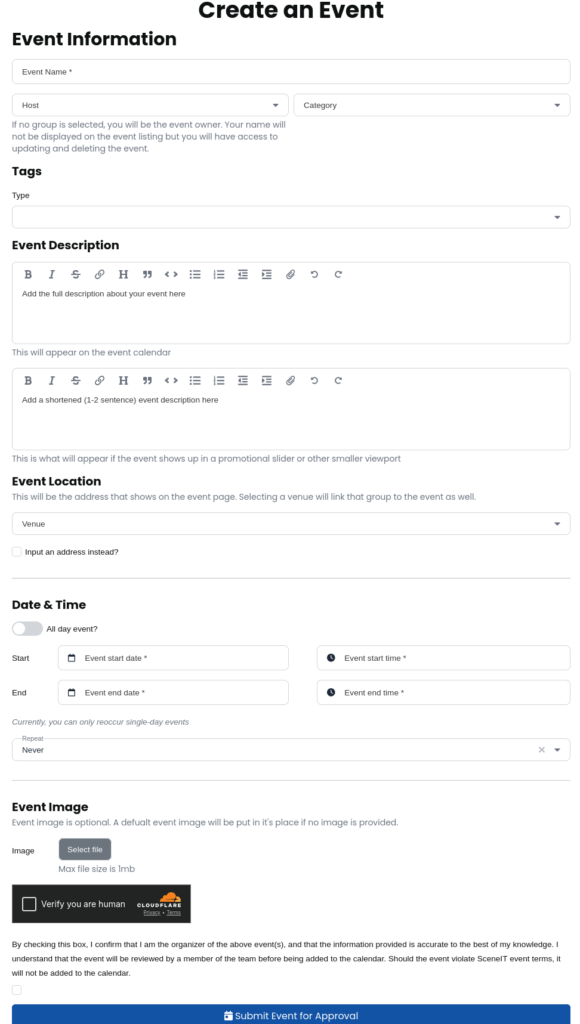 - Please, read our terms of use before listing an event, and ensure your event does not violate any guidelines for being on SceneIT