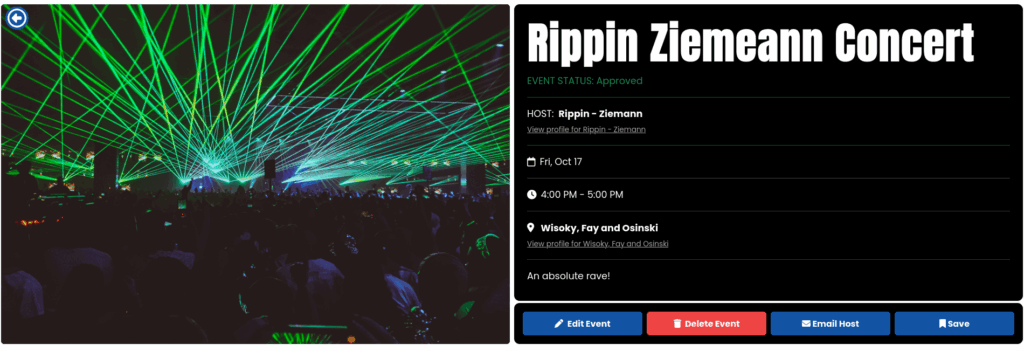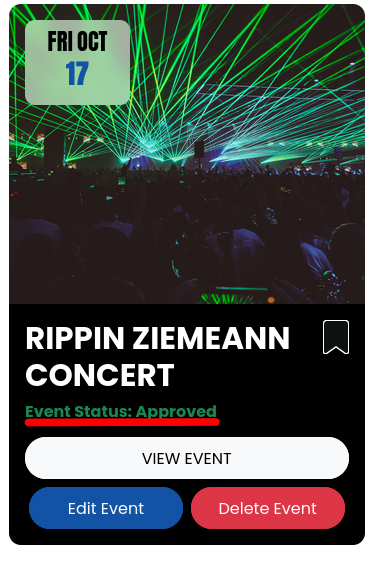 Here, you will see the status of your event – when you create an event, it is submitted for admin approval. Once approved, it will display in the general calendar! You can view the status of your event any time in the mine tab: