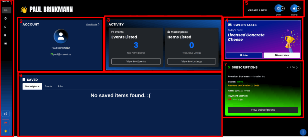 - The Activity card contains information about your activity on other parts of our site, allowing you to easily navigate to your Events Dashboard in the Calendar (HOW TO: List an Event on SceneIT) or your Seller Dashboard in the Market (HOW TO: List an item on the SceneIT Market)