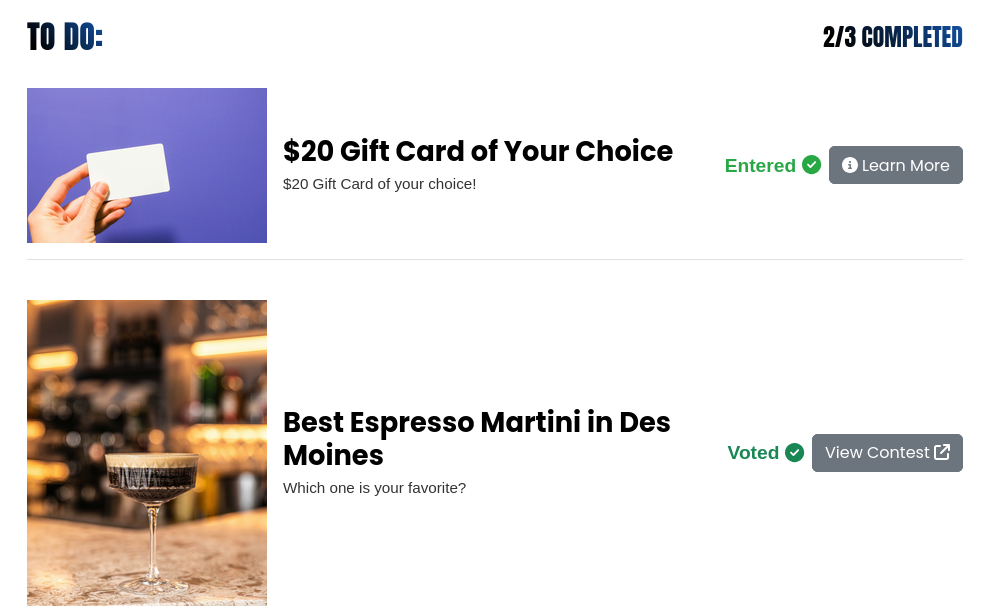 The Daily Actions page shows you all the actions you can take today on our site. Entering a sweepstakes, voting on your favorite pizza chain in the Des Moines Area, and more – it’s all easily findable here!