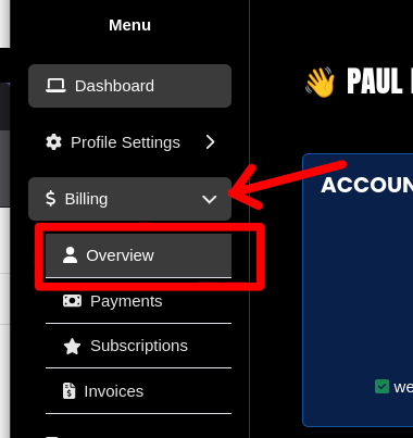 This section allows you to see active subscriptions on your account, previous invoices, associated payment methods, and more!